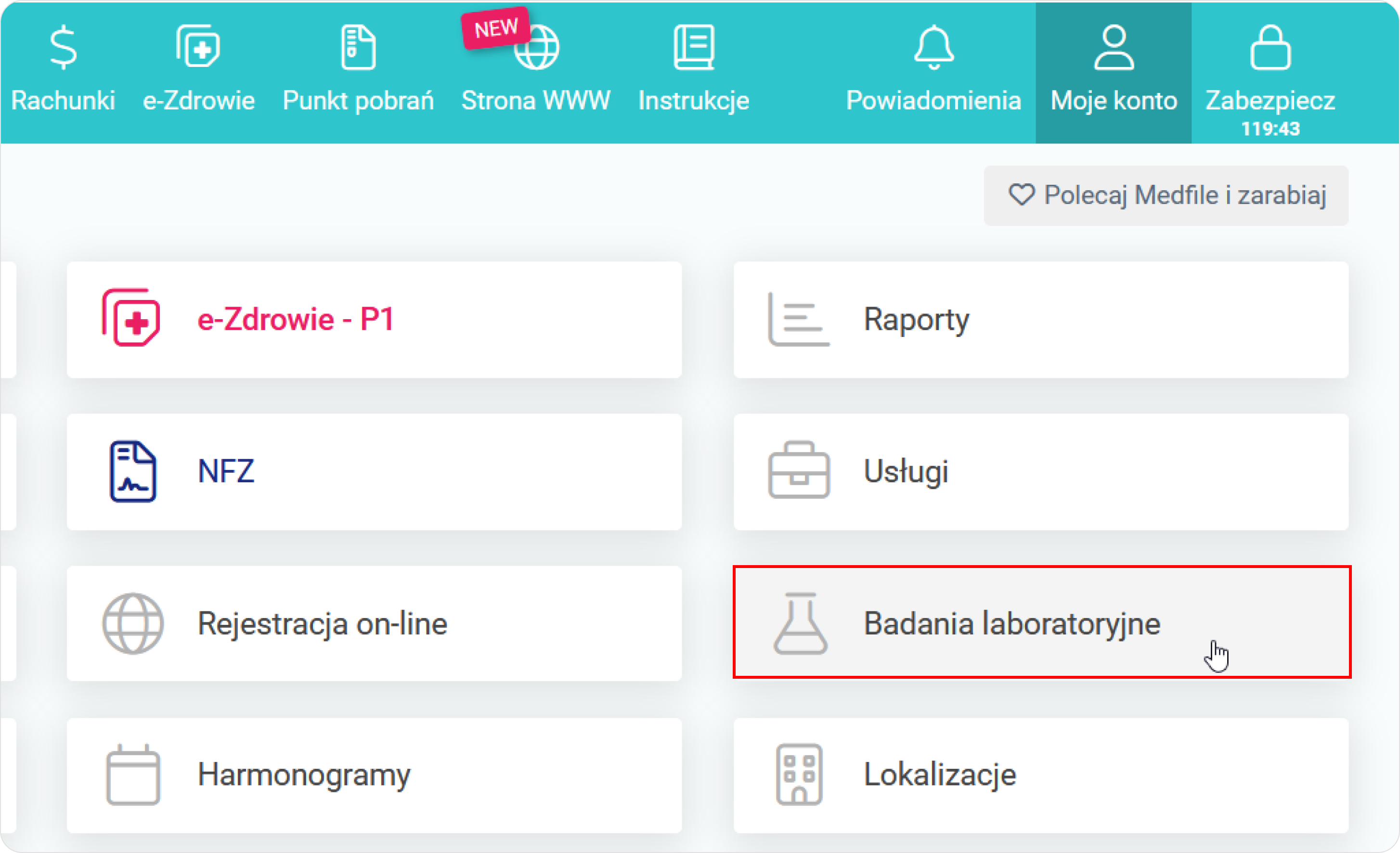 Z perspektywy zakładki „Moje konto”, klikamy na kafelek „Badania laboratoryjne”.