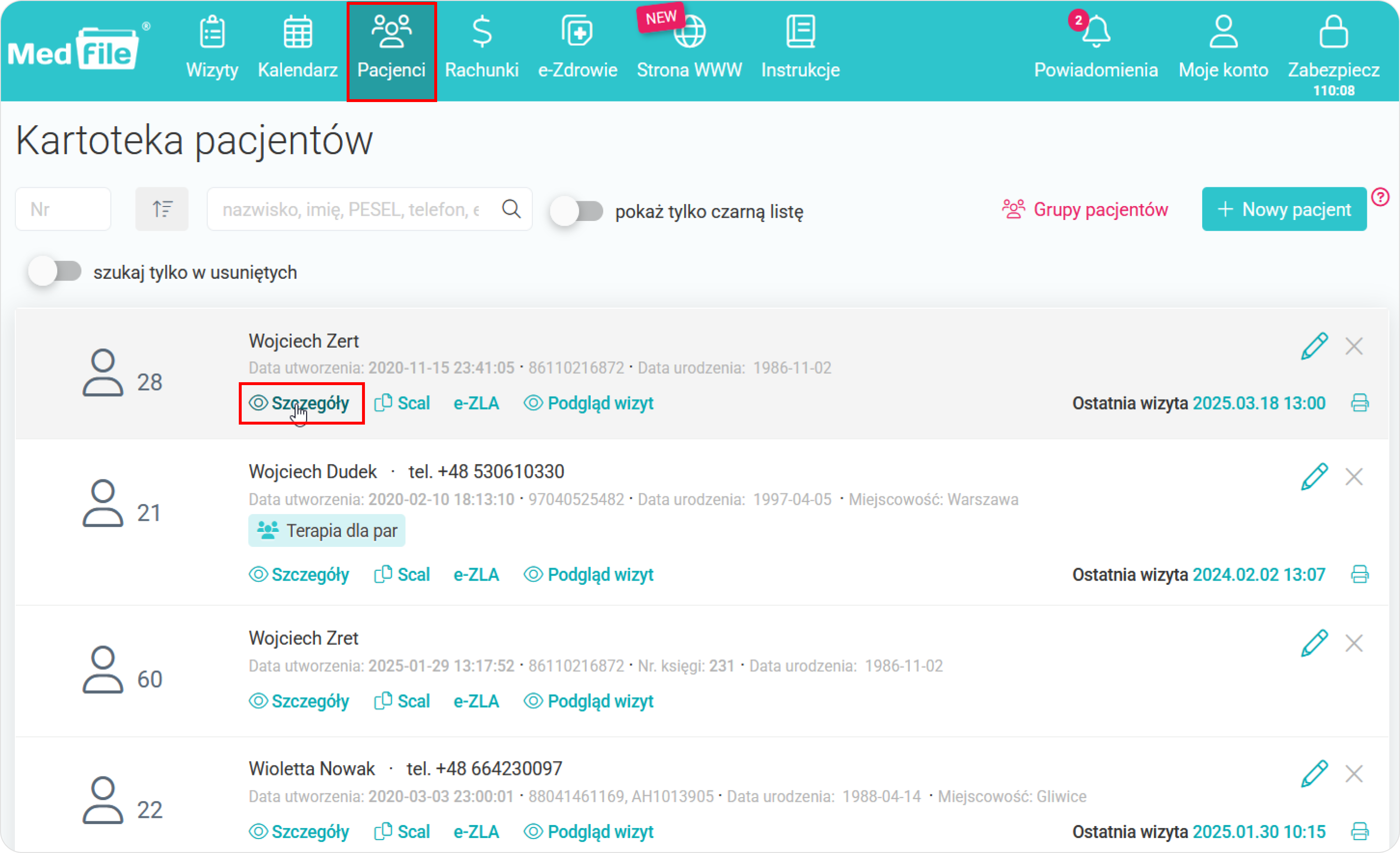 Z perspektywy zakładki „Pacjenci”, klikamy na „Szczegóły” przy odpowiednim pacjencie.