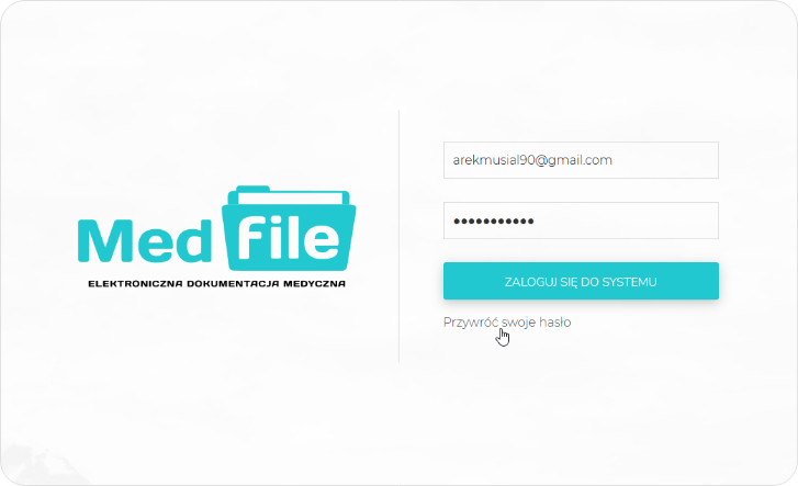 System Medfile nie przechowuje haseł użytkowników w sposób umożliwiający ich odczytanie. W przypadku zapomnienia hasła należy na ekranie logowania kliknąć „Przywróć hasło”. Na adres e-mail przypisany do konta zostanie wysłany link umożliwiający ustawienie nowego hasła dostępu.