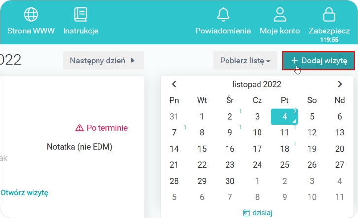 Z perspektywy zakładki „Wizyty”, klikamy w kafelek „+ Dodaj wizytę”.