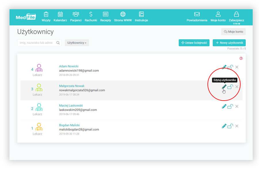 W zakładce „Użytkownicy” przy lekarzu, którego chcemy edytować, klikamy w „ołówek” po prawej stronie, bądź w imię i nazwisko lekarza. Zobacz więcej.