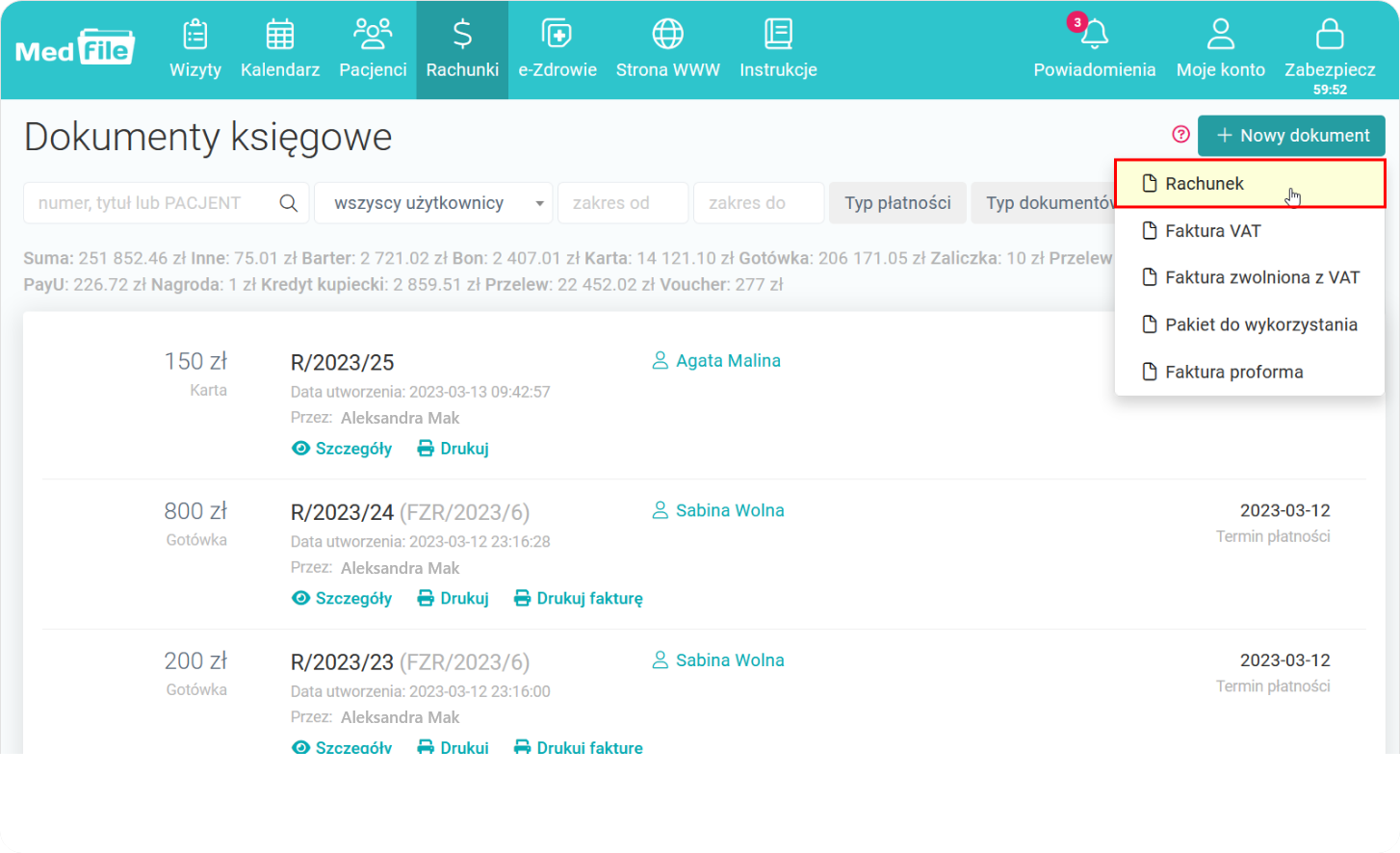 W trakcie wizyty wybieramy opcję „Wystaw rachunek”, która znajduje się po prawej stronie lub bezpośrednio z zakładki Rachunki klikamy na „+ Nowy dokument", a następnie wybieramy komunikat „Rachunek".